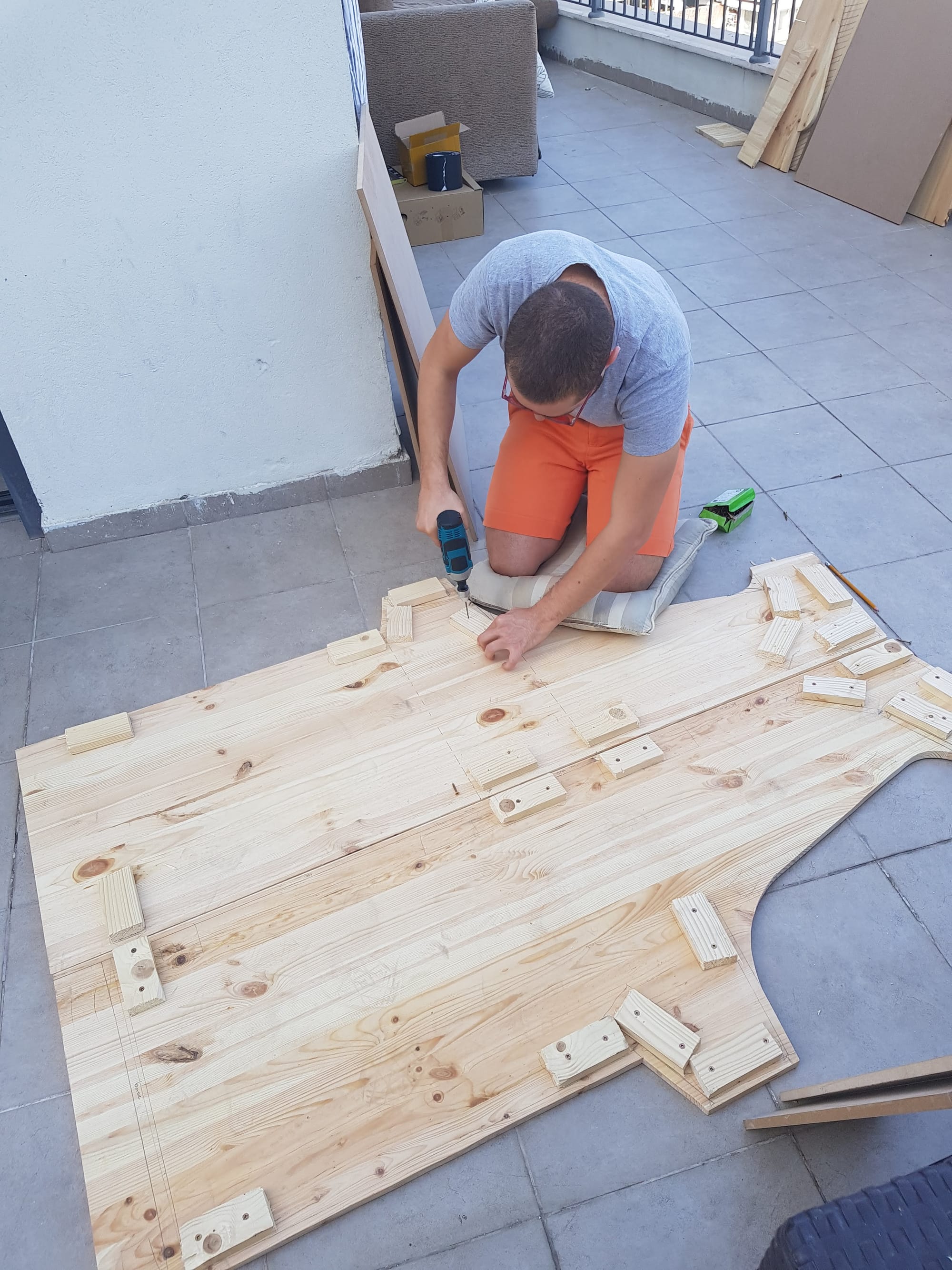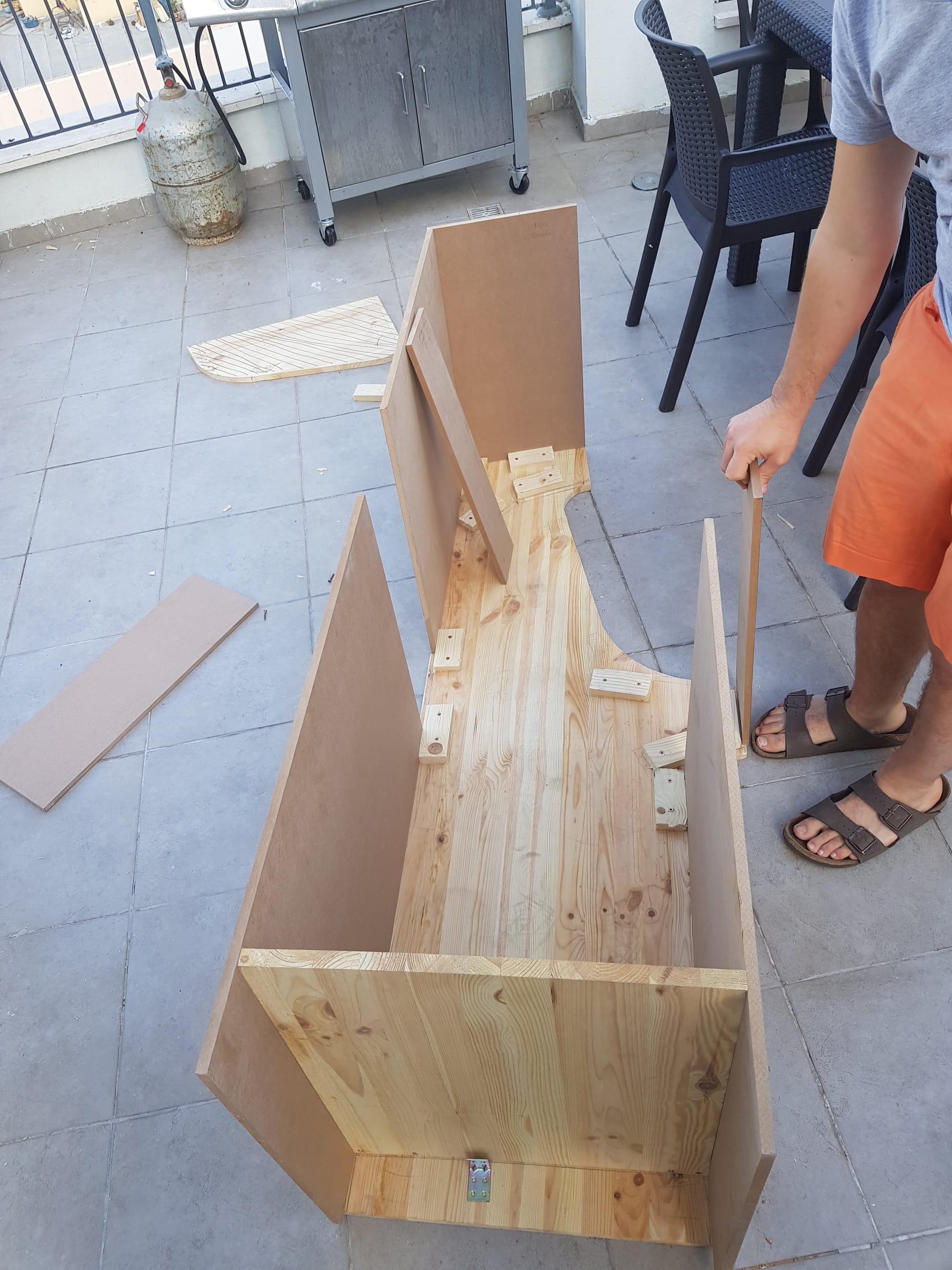 We added wooden blocks/braces inside to screw panels together solidly. Slowly, it began to take shape.